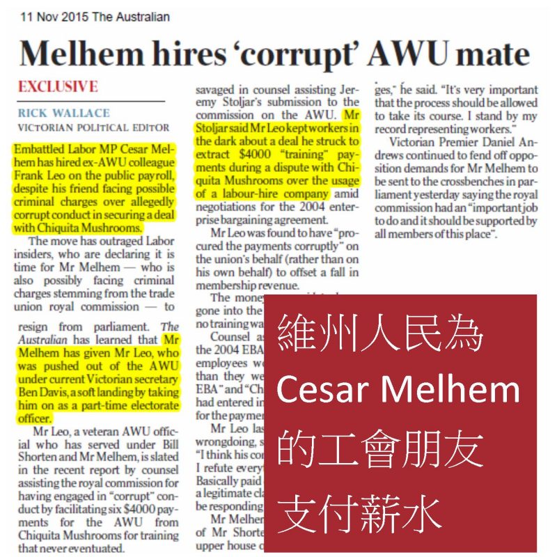 Read more近日律师们集体建议政府对维州工党议员 Cesar Melhem 提出刑事犯罪指控,指控内容为他在任职工会官员期间可能涉及不当的金钱交易。 据报导指出 Cesar 连同其他工会官员在劳工不知情的情况下收取企业所提供的不当费用,而工会官员由于代表企业劳工和企业谈判而引发违法质疑。 报导中也提到有许多工会代表劳工和企业谈判的案子都出现谈判后工会接受比原本劳工应得条件更低的待遇结果。 报导更指出自从 Melhem 当选进入维州议会开始, 他即使用公家费用聘用另一名涉案的工会官员为其助理, 此举进一步引发各界质疑。 此一事件除了体现出工会可能潜藏的腐败问题外,更重要的是引发人民对司法改革的省思。 推动司法改革方能控管工会官员涉及利益冲突并从中牟利的事件可不再发生。也唯有如此,工会才能真正无私的站在劳工的立场为劳工争取权益与福利。 英文版: Cesar Melhem scandal shows