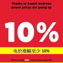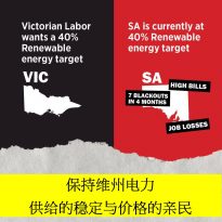 维州电价正在迅速的上涨,随着四月份 Hazelwood 电厂关闭,我们也面临供电不稳定的风险。 儘管潜在的危机,Andrews 政府仍意图进一步提高现今科技还不到位,电价仍然高昂的供电模式,例如风力和太阳能的供电比例,种种举动让维州电力稳定性和电价犹如雪上加霜。 好高骛远,超过当前科技所能负荷的供电目标已有失败先例,邻近的南澳地区,高昂的电价和不稳定的供电状态对产业和民生的冲击就是最好的实例,我们不能让维州也步入南澳的后尘。 与其维州标新立异,制定好高骛远又不切实际的再生能源规则,不如尊循整个澳大利亚政府的能源准则,在循序渐进中求新求变,既可兼顾创新,又可维持能源供给稳定性与价格亲民性。 如明年维州自由党政府于大选中胜出,我们将废除维州现今的再生能源目标,循序渐进中求改变,还给维州产业和人民一个更稳定也更实惠的供电模式。 英文版/English version Keeping electricity reliable and affordable Electricity prices are