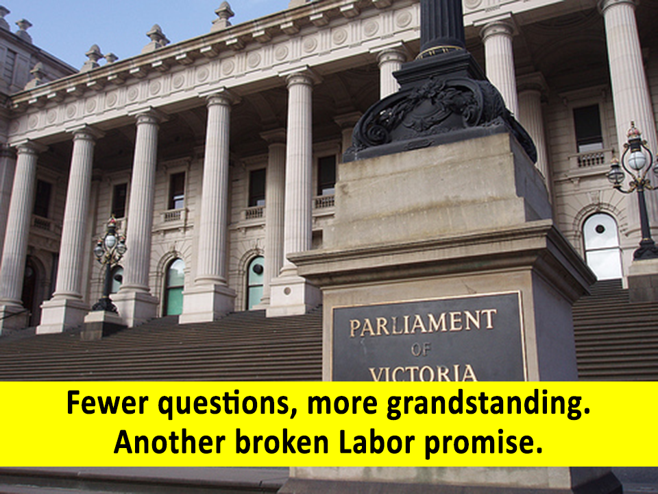 Question time is a key part of government accountability to Parliament and the community. Far from reforming question time as Mr Andrews promised, he has broken his promise and replaced question time with a farce.