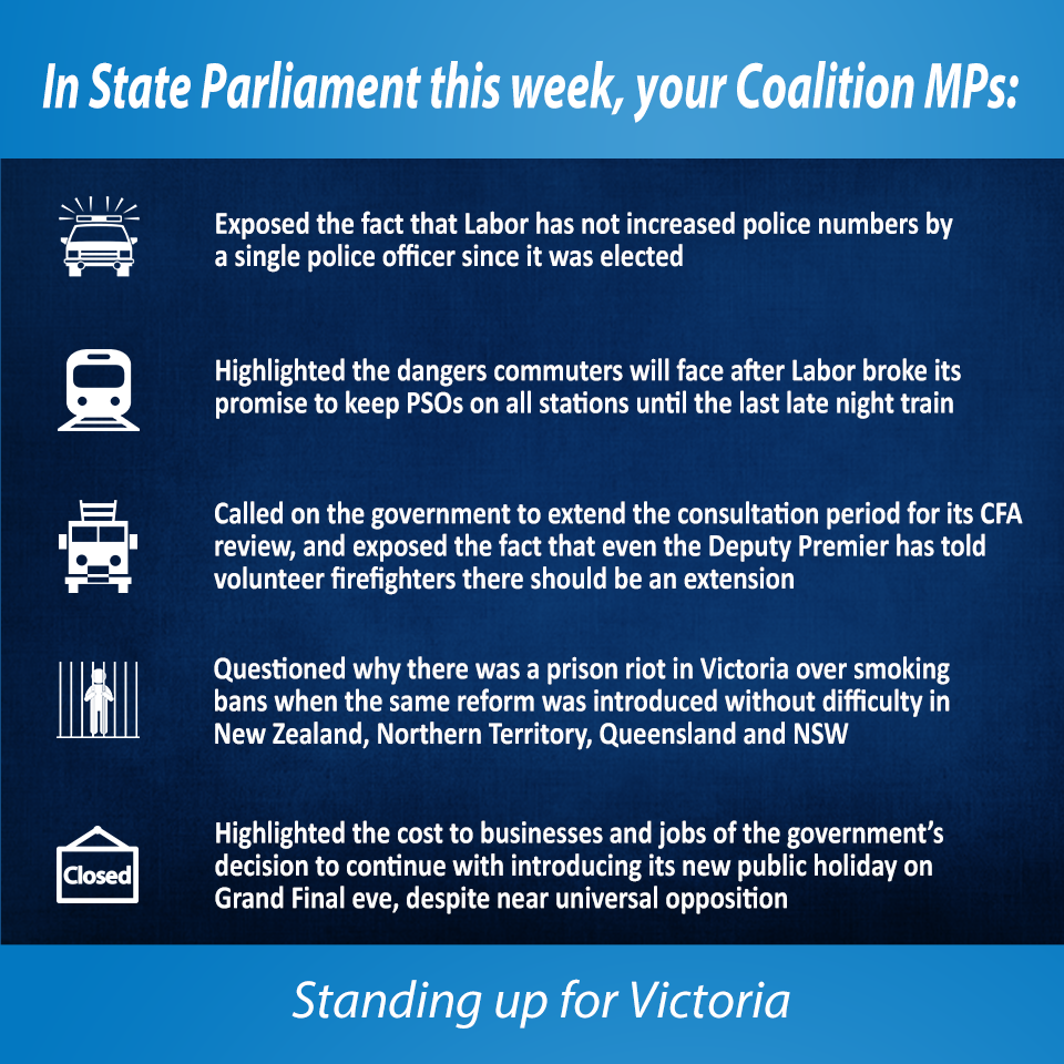 This week in State Parliament, Liberal and National MPs exposed the fact that Labor has not increased police numbers by a single police officer since coming to office, despite Victoria’s continuing population growth.